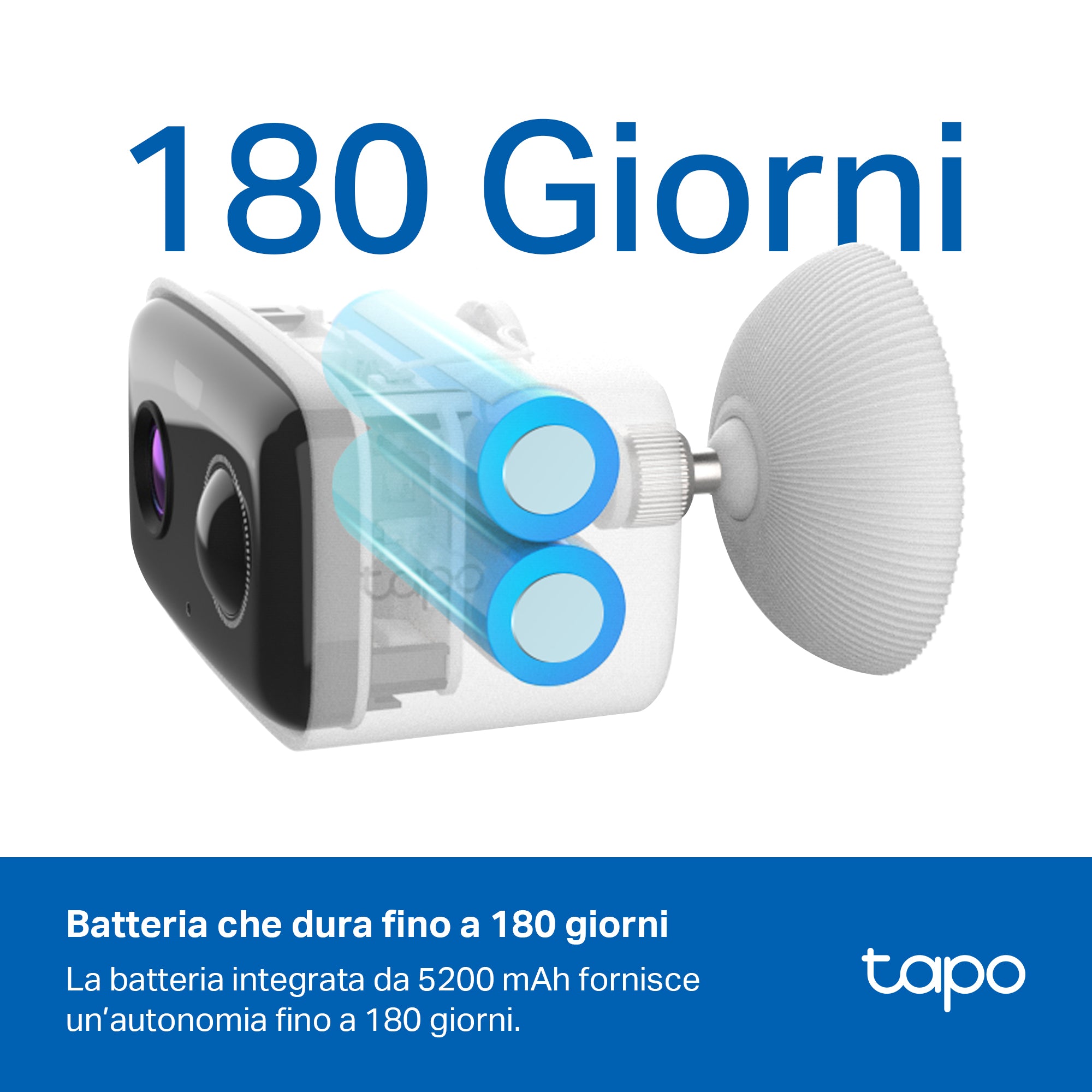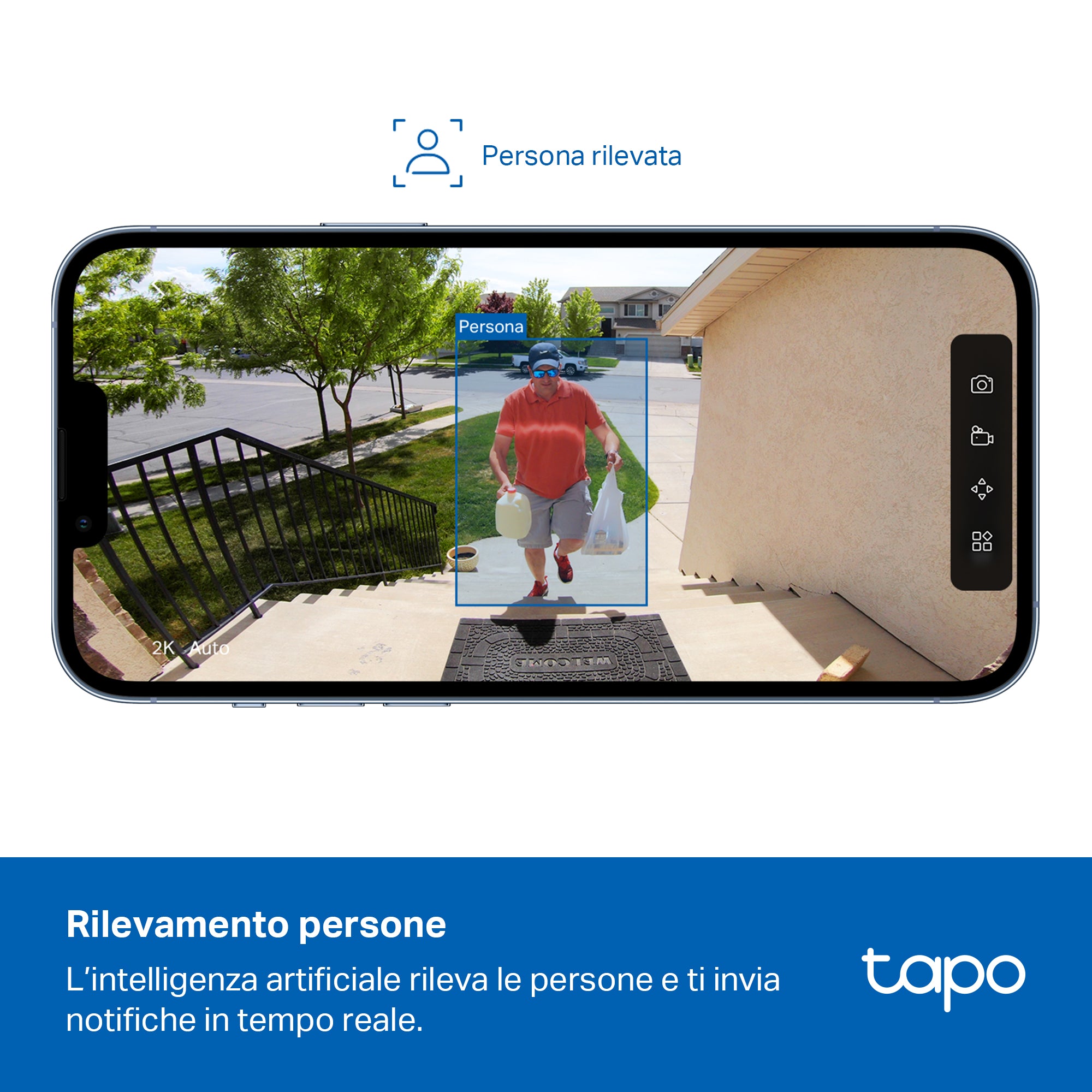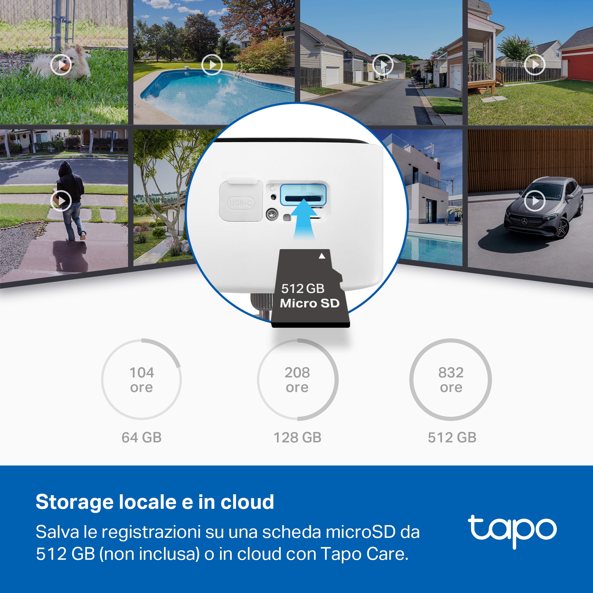 - ● Archiviazione locale e cloud - registra localmente su una scheda microSD da 512 GB (non inclusa) o abbonati a Tapo Care per 30 giorni di archiviazione cloud.