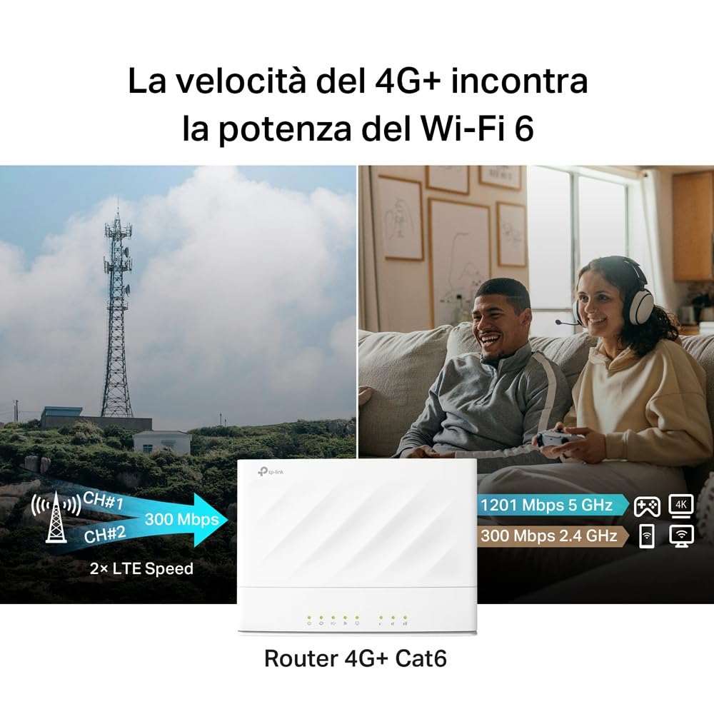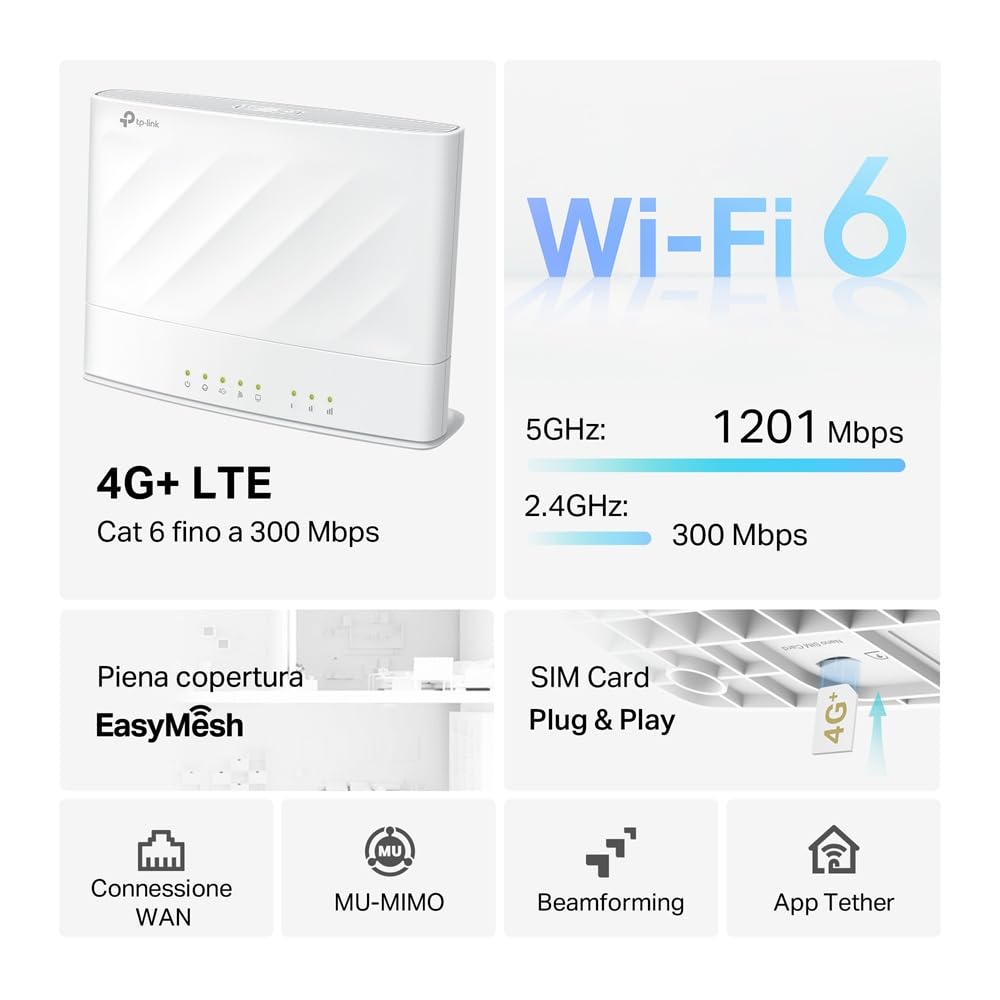 TP-Link Archer MX1500 Router WiFi con Sim, 4G+Cat6 AX1500 Dual Band, 4 Gigabit Porte LAN+ Porta Gigabit LAN/WAN, 128 Dispositivi Supportati, APP, Plug&Play